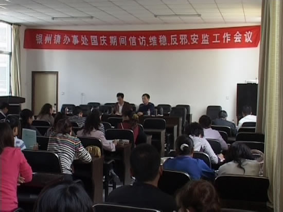 9月15日,银州镇办事处举行“国庆期间信访、维稳、反邪、安监工作会”。会议指出,在国庆60周年来临之际,街道办事处所有工作人员要全面做好防范准备工作。在信访方面要积极主动与群众沟通交流,把矛盾化解在基层,杜绝因小问题而引发大矛盾、大事件的发生。在化解矛盾的过程中,各社区负责人要采取有效措施掌控局面。国庆期间的反邪教工作决不能松懈,要监控可疑组织,可疑人物,确保国庆期间社会和谐稳定。所有工作人员要重视国庆期间的信访、维稳、反邪、安监等工作,树立安全理念,落实各项责任,营造良好和谐的社会环境。