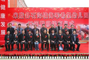 在开园仪式上,鄂尔多斯市万恒元房地产开发有限公司董事长冯海军的亲属冯学海代表冯海军向石沟镇移交海军希望幼儿园。为表达感激之情,石沟镇党委,政府向冯海军赠送了写有“情系家乡、捐资助学”的牌匾。为支持家乡教育发展,石沟商会会长杜海荣代表石沟商会向海军希望幼儿园捐赠了价值两万元的幼儿服装和被褥。海军希望幼儿园则向石沟商会赠送了写有“爱心助学、惠泽桑梓”的牌匾,以表感谢。