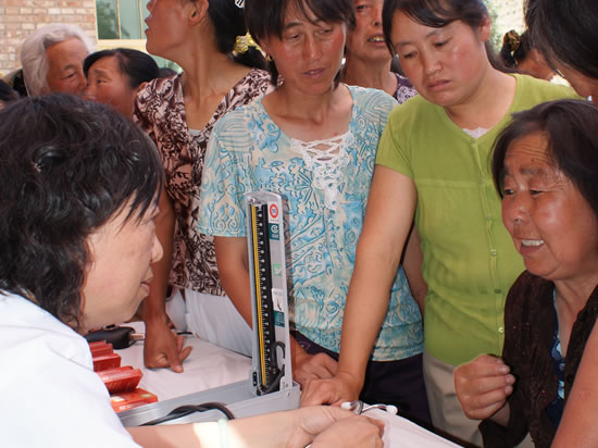 6月25日,市计生局、市老医协医疗扶贫队携带器械和药品深入米脂县印斗镇柳坡村为村民进行义诊并现场发放药品。自2006年以来,市计生局组织医疗扶贫队在柳坡村举行义诊3次,共接待患者300余人,免费发放药品15000元。市计生局还为改善该村村阵地建设提供资金5万元。图为医疗扶贫队专家为村民群众义诊。