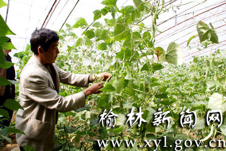 5月4日,米脂县十里铺乡井家畔村村民井长怀正在自家的大棚内采摘成熟的豆角。近年来,该村积极调整农业产业结构,发展大棚反季节蔬菜40余亩,仅此一项,每年可为全村增收40余万元。大棚菜已成为井家畔村增收的“聚宝盆”。