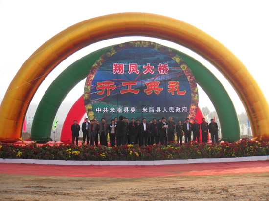 翔凤大桥建设工程前期工作于2008年初启动。在县委、县政府的直接领导下,在人大、政协的具体指导下,在有关部门单位的辛勤努力下,勘查现场,规划设计,反复评审,敲定方案。在此基础上,工程招标,征用土地,落实用电,平整场地,历经近一年时间,完全具备了开工条件。20081017日举行了隆重开工奠基仪式,启动实施建设。