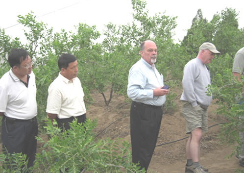 在银州镇孟岔村,美国教授先后参观了该村山地红枣基地建设规模,枣醋加工厂,并认真听取了县长助理朱云及枣农的有关红枣产业和节水灌溉等发展情况介绍。