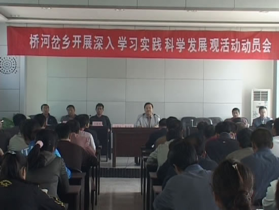 9月15日,桥河岔乡召开“学习实践科学发展观动员会”,会议指出,科学发展观是加强乡、村党组建设和党员干部建设的必须要求,为了使学习实践活动有序开展,各村党支部、各参学单位要严格按照实施方案的要求,准确把握学习实践活动的指导思想、目标原则,严格按照“党员干部受教育、科学发展上水平、人民群众得实惠”的目标要求。在学习实践科学发展观活动中,要把学习贯穿于活动的始终,丰富内容,创新方法,注重实效。根据党员的职业特点、文化层次和思想状况等实际,在认真组织好规定篇目学习的基础上选学一些其它知识。要针对领导党员、机关党员、教师党员、流动党员、退休党员、老龄党员等的不同特点,采取灵活多样的学习方法,确保学习率,做到应学尽学,不漏一名党员,确保学习取得实效、惠及群众、推动工作、促进发展。通过学习使得我们的思想再解放,认识再提高,观念再更新。要广泛开展调查研究,充分了解农村群众、教职员工、医疗工作者的所思、所想、所盼,深入查找工作中存在的问题,乡村领导班子成员要围绕村级党组织“升级晋档、科学发展”这一主要内容创新工作。在保增长、保民生、保稳定和改进干部作风等方面要进行走访调研,到群众中去,摸清实情,为民解忧。